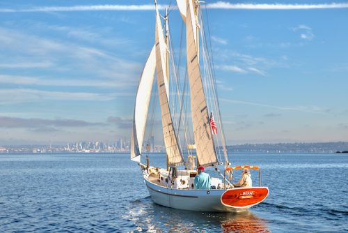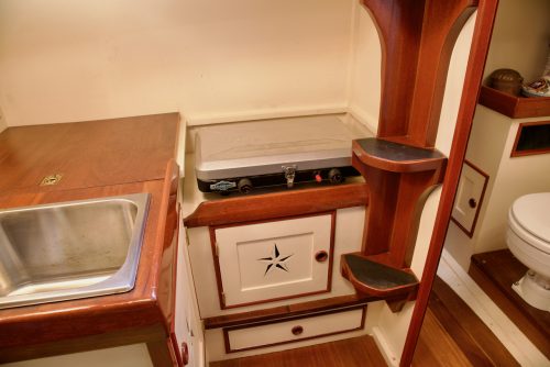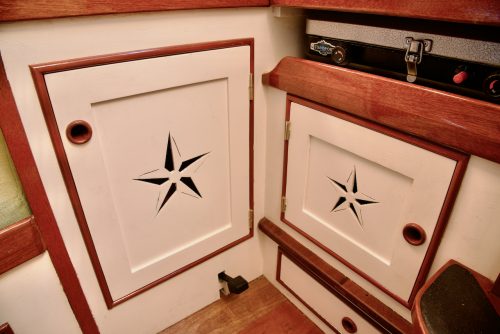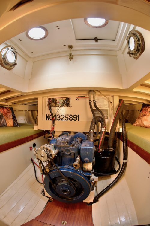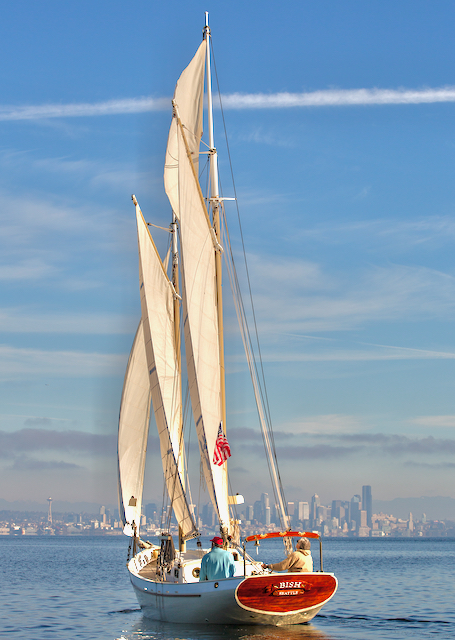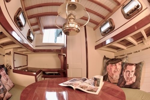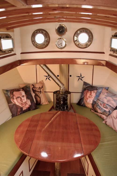 I think writer Larry Cheek did a great job of capturing my thinking and process. And Neil Rabinowitz did a great job of photography the boat at sail… even though there was almost no wind, and a freezing fog. Hey, December in Seattle is not exactly tropical. I shot the interiors, but as you can tell, it is very small inside and not much to show. Since there aren’t any large bulkheads, I used the pillows to show my mom’s paintings of my dad, Bish. He was a wondrous adventurer, mostly armchair in his later years. But he was my mentor (in a quiet way) and idol. This boat is dedicated to his spirit and love.