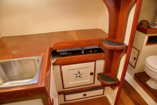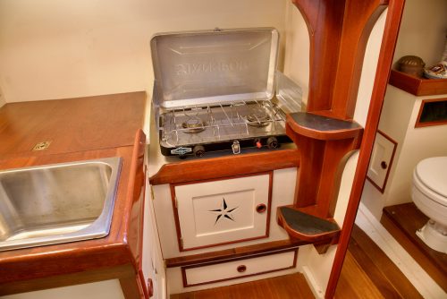 Finally, after 12 years we have splashed. The “Bish…the build” section shows the progress pictures from start to first sail. Now that we have launched, Wooden Boat Magazine published an article about BISH in the March/April issue. There was a bit of a snafu in that they ran one of my interior pictures twice and left out the shot they were going to use of the saloon… but, Oh Blau de, Oh Blau da, Life goes on.