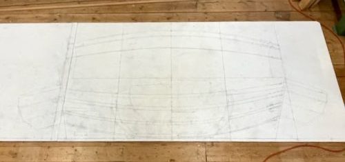 From the plans, I have drawn out the profile and half-breaths of the new boat on 2 4×8 sheets of plywood painted white.