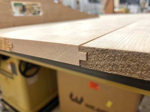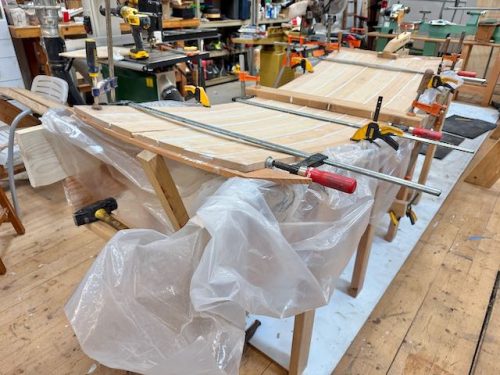 After setting up, I applied a bead of 5200 to both sides of the tongue and inserted each tongue into the appropriate groove of the adjacent piece. Clamped it all together and now will let the 5200 setup. This can take a couple weeks, which is fine as there is still some snow in Sun Valley for some snow-showing and cross-country skiing.