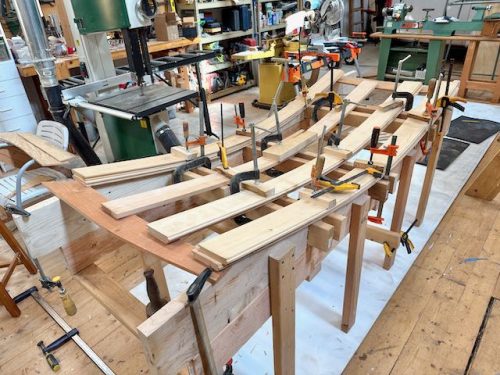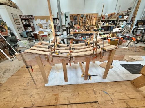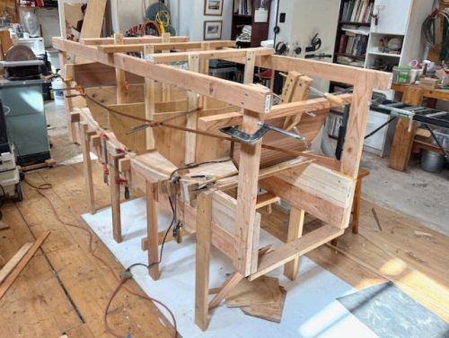 OK. The cedar floor planks have now been steamed and bent onto the strongback.