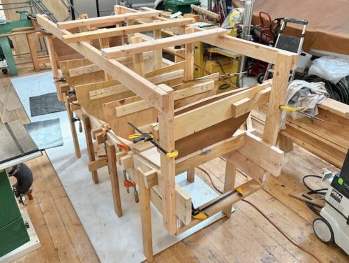 Next step… build a framework capable of stabilizing the molds, plus bow and stern transoms. The transoms are two-part mahogany.